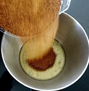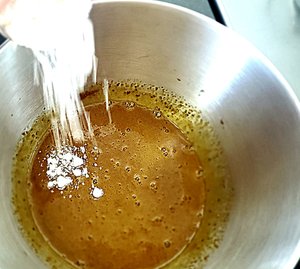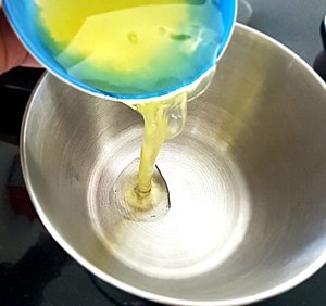 Add the flour into the vanilla cream mixture while leaving the mixer on.