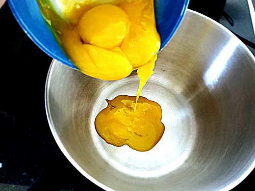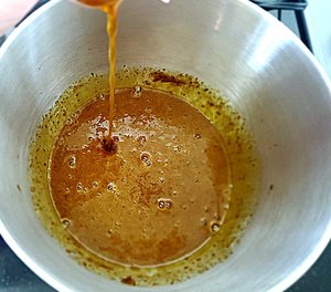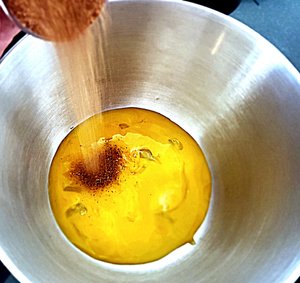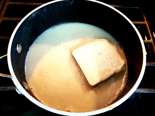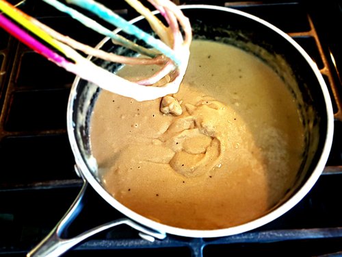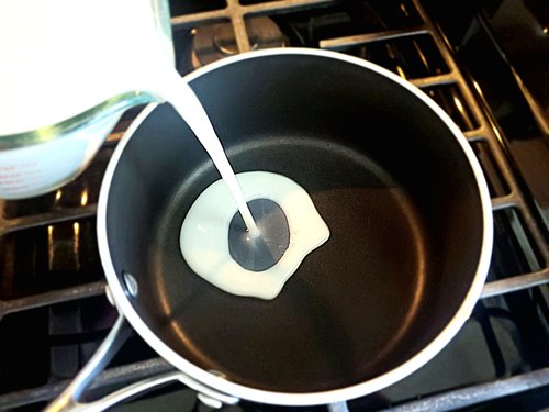 Pour the vanilla cream mixture into the pot with the heated milk and melted butter.
