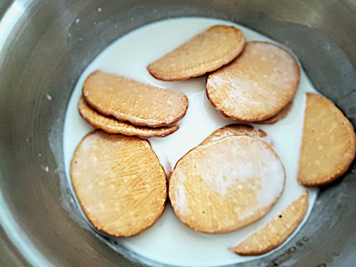 Soak the biscuits in milk for few minutes until soft but not mushy.
