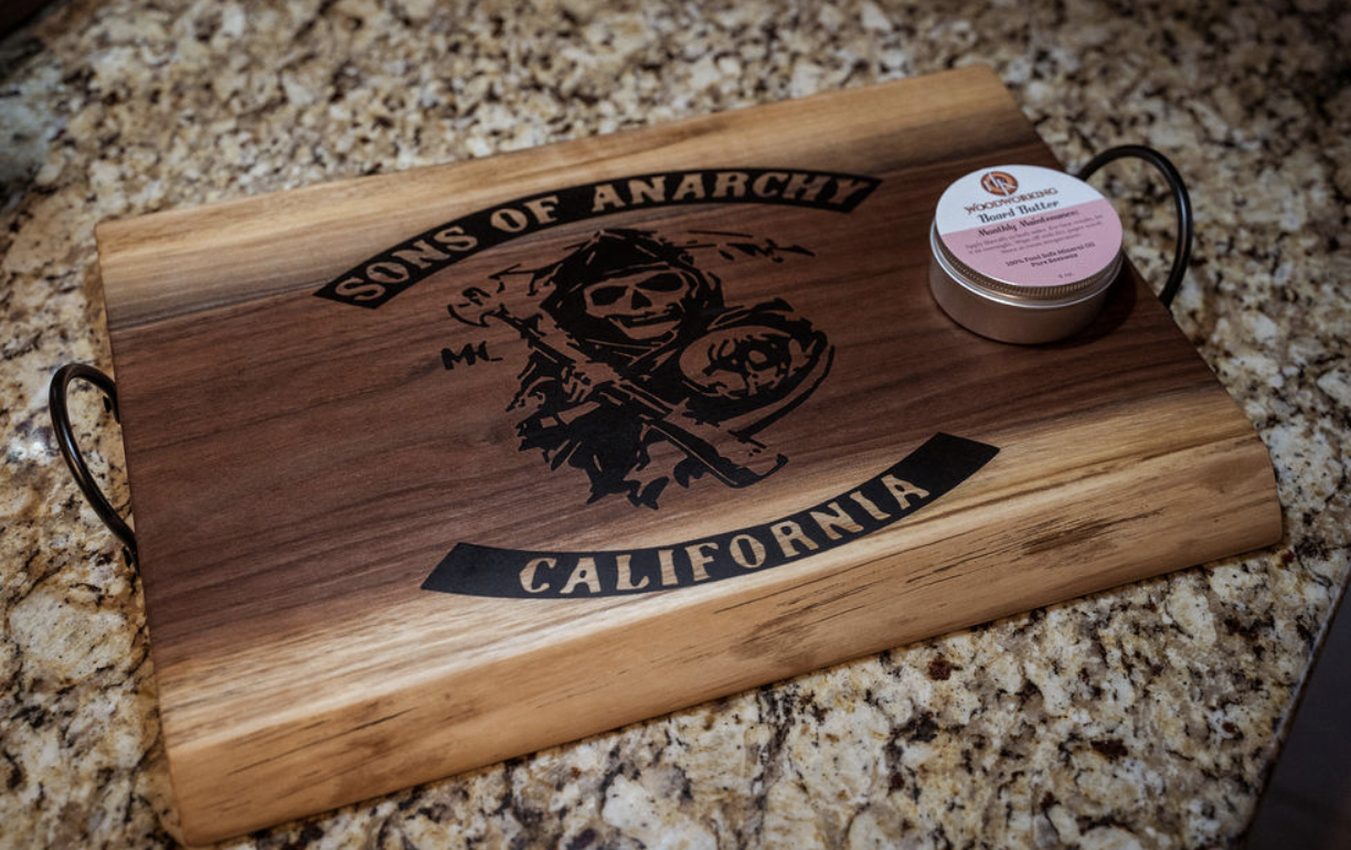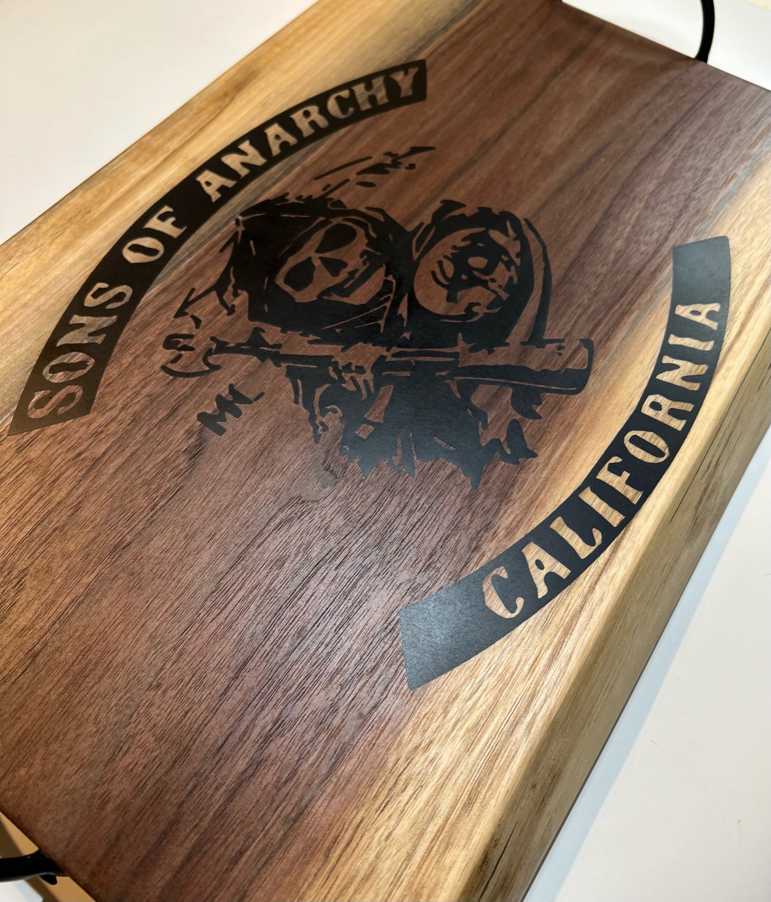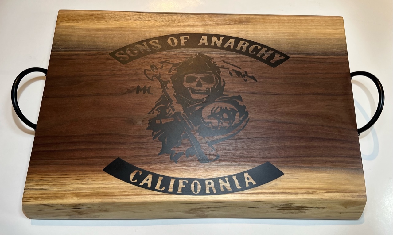Pay homage to the hit TV series with my Sons of Anarchy serving tray. Featuring the iconic Reaper logo, this tray combines fandom with functionality. The solid handles make it easy to carry and serve your favorite snacks, while the thick construction ensures durability for long-lasting enjoyment.