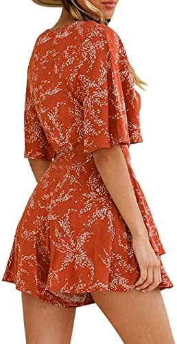 AIMCOO Womens Summer Short Flared Sleeve Romper V Neck Floral Print Jumpsuit Waist Tie Layer Ruffle Hem Dress Look…