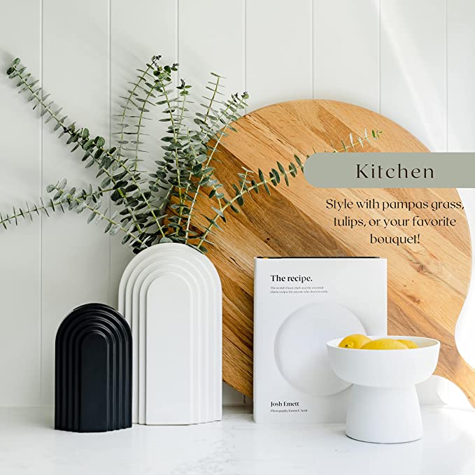 About this item Tasteful sculptural design that is a striking addition to any interior The arched shape and bold lines make these ceramic vases effortless decor in any space in your home Use these as flower vases; show off your fresh blooms, dried flowers, or leave them empty as beautiful modern sculptures Influencer home decor pick -make your Pinterest dreams come true! Crafted from high quality porcelain, this vase set consists of a 9.45” tall white vase and a 6.3” small black vase which you can style together or separately