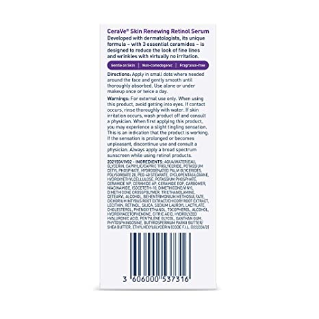 Developed with dermatologists, CeraVe Skin Renewing Retinol Serum is designed to help diminish the appearance of fine lines and wrinkles while also helping to repair the protective skin barrier with 3 essential ceramides (1, 3 and 6-II). This anti-aging retinol serum for fine lines is a gentle, yet effective daily retinol serum that is ideal for all skin types. •Fragrance-free