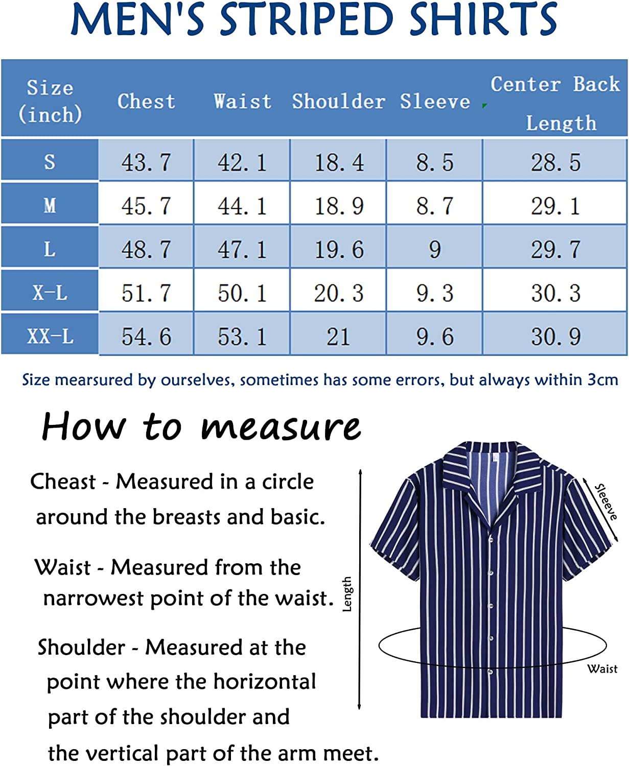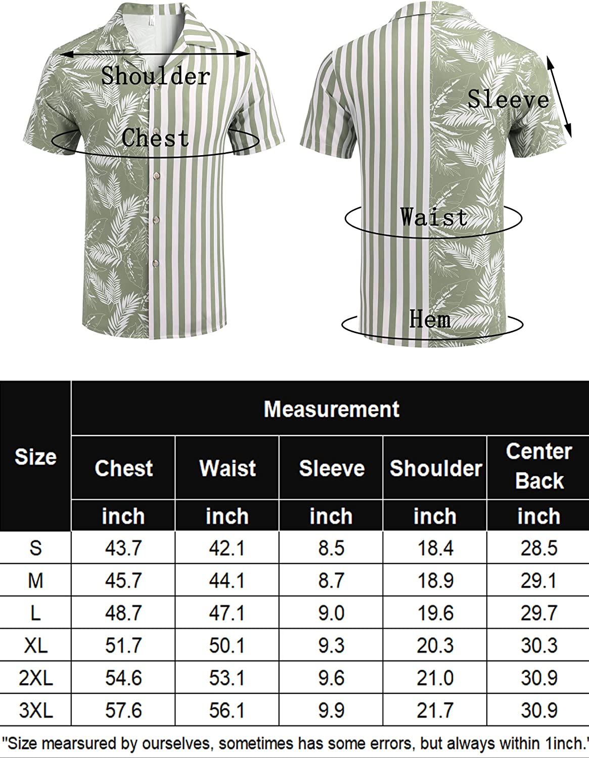 100% Polyester Button closure Machine Wash 【Soft Fabric】Mens tropical shirts short sleeve made of lightweight and high quality fabric, providing you with a comfortable and nature skin feel. 【Fashion Design】Classic vertical stripes and tropical elements stitched together. Coconut trees, leaves, and other prints, each of which is a unique experience! 【Classic Summer Wear】The men striped button down shirt features with loose fit, button up closure, turn-up collar. Multiple colors and patterns to choose from. It’s the best gift for your families, friends and lover on special days or vacation. 【Occasion】The mens hawaiian floral shirt is suitable for many occasions especially casual outings, beach and vacation activities. Perfect for spring, summer and autumn, fashion street style, dating, hawaiian, everyday casual wear, beach wear and etc. 【Warm Tips】Washing Max Temperature 40°C. Machine washable for the mens resort wear shirts. Please refer to our size chart carefully before you order. If you like to be looser, please choose next size.