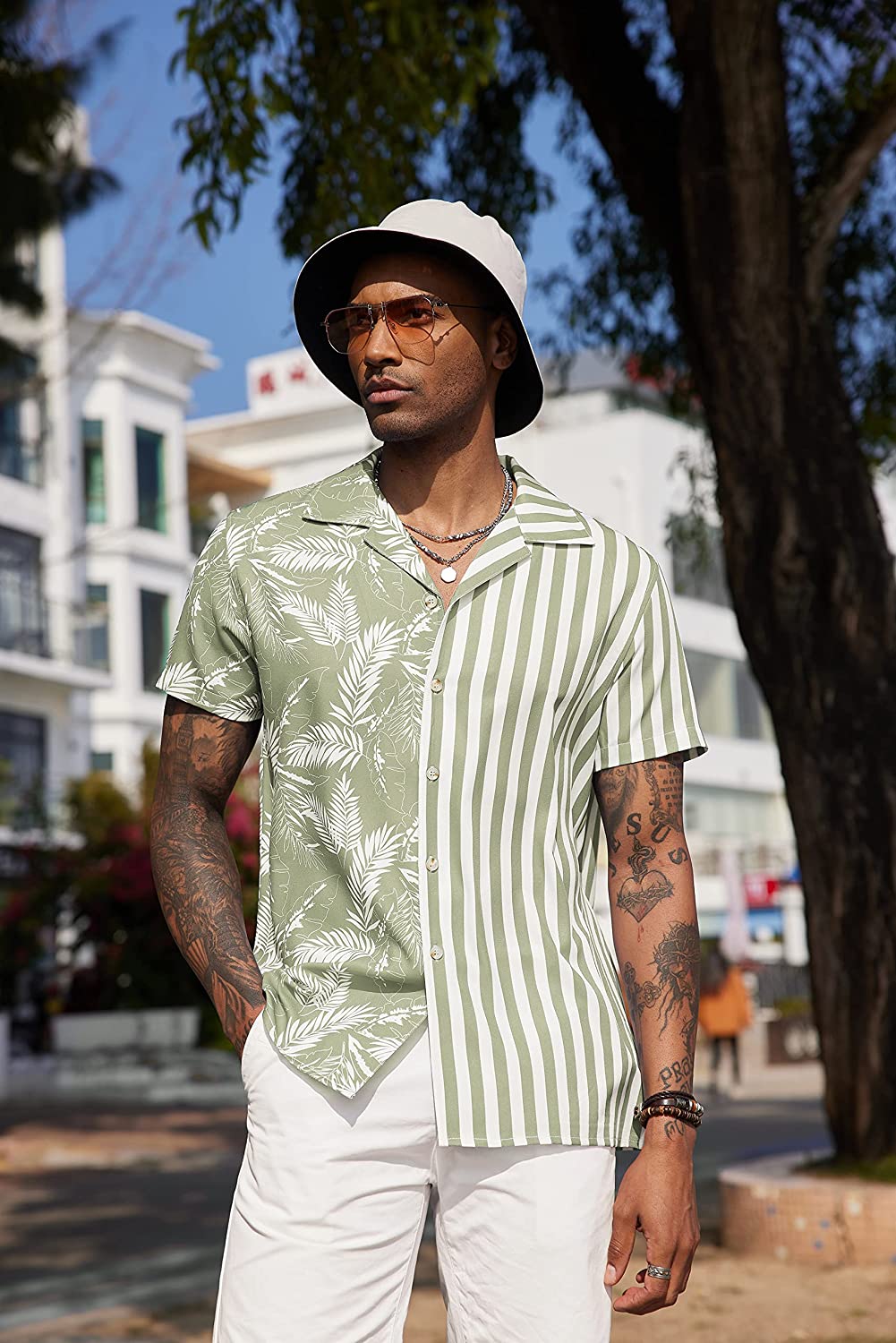 If you have a muscular physique (or plan to gift this shirt to someone with a muscular physique), you’ll notice that the neckline of this shirt causes the trapezius (traps) to pop. (“Pop” is bodybuilder speak for noticeable.)Moreover, the patterns–a combination of palm trees and stripes–seem a bit odd. But it works. If you’re like me and desire to standout, this shirt provides much uniqueness.As for fit, it fits a little on the large side. However, if you have a muscular build, the shirts large fit won’t be a problem because it hugs your upper frame (shoulders, traps, chest), giving you a healthy and strong look.Finally, it’s made from quality material. Specifically, it’s made from the type garment that makes a person say, “Feel how comfortable this is.”Ultimately, I like this shirt. I can’t wait to rock it during the spring. Price is right, too.