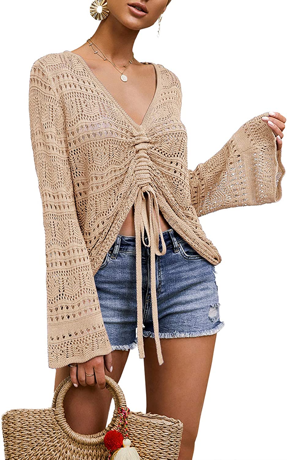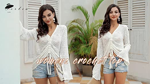 ❤ Feature: Loose fit, V neck, drawstring, hollow out, cropped, Lightweight, swimsuit cover up, bell sleeve, casual and fashion. Available colors: White, Light Purple, Grey, Black, Khaki, Rose.