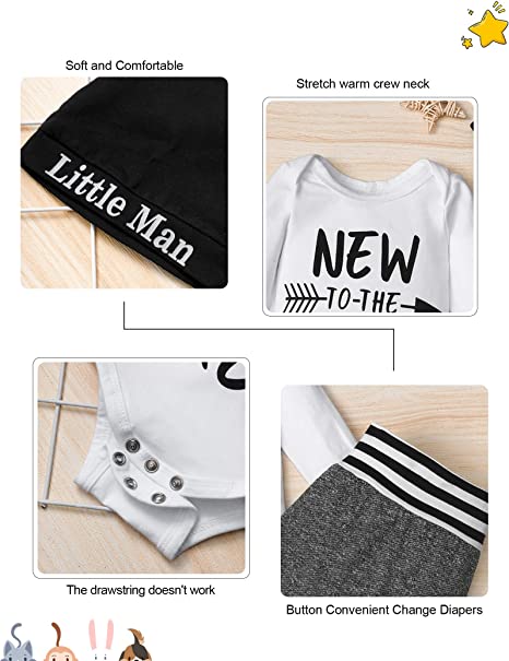 Be the first to review “Fommy Newborn Baby Boy Clothes New to The Crew Letter Print Romper+ Pants+Hat 3PCS Outfit” Cancel reply