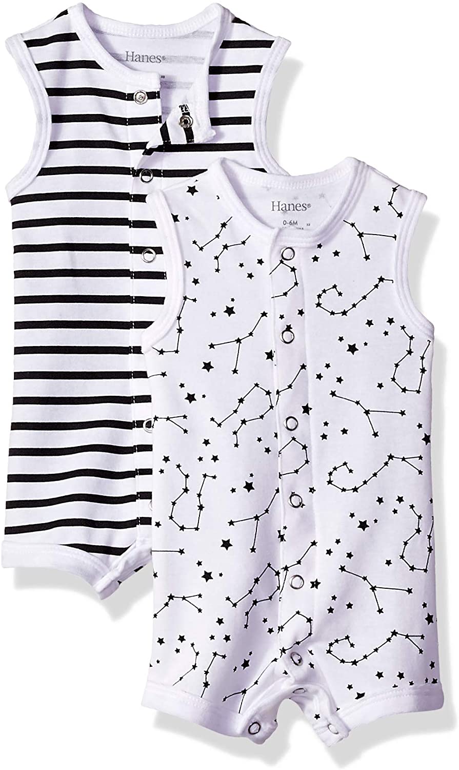 Hanes Ultimate Flexy 2 Pack Sleeveless Rompers were designed with baby in mind. They are super soft, flexible, and are available in 4 simple sizes to fit baby longer.