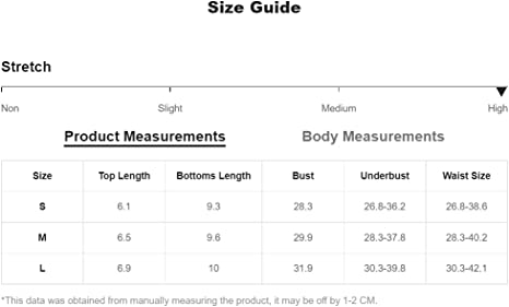 L:Tops–Length: 6.9″, Bust: 31.9″, Underbust: 30.3-39.8″;Bottoms–Length: 10″, Waist Size: 30.3-42.1″,