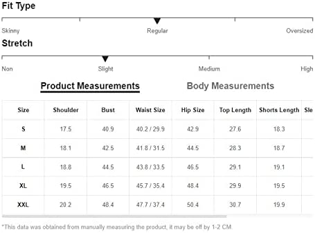 Size Chart: Small: Shoulder:17.5″, Bust:40.9″, Waist Size:40.2 / 29.9″, Hip Size:42.9″, Top Length:27.6″, Shorts Length:18.3″, Sleeve Length:8.4″, Cuff:13.7″, Thigh:27.3″/ Medium: Shoulder:18.1″, Bust:42.5″, Waist Size:41.8 / 31.5″, Hip Size:44.5″, Top Length:28.3″, Shorts Length:18.7″, Sleeve Length:8.7″, Cuff:14.2″, Thigh:28.1″/ Large: Shoulder:18.8″, Bust:44.5″, Waist Size:43.8 / 33.5″, Hip Size:46.5″, Top Length:29.1″, Shorts Length:19.1″, Sleeve Length:8.9″, Cuff:14.7″, Thigh:29.2″/ X-Large: Shoulder:19.5″, Bust:46.5″, Waist Size:45.7 / 35.4″, Hip Size:48.4″, Top Length:29.9″, Shorts Length:19.5″, Sleeve Length:9.2″, Cuff:15.3″, Thigh:30.3″/ XX-Large: Shoulder:20.2″, Bust:48.4″, Waist Size:47.7 / 37.4″, Hip Size:50.4″, Top Length:30.7″, Shorts Length:19.9″, Sleeve Length:9.4″, Cuff:15.8″, Thigh:31.3″