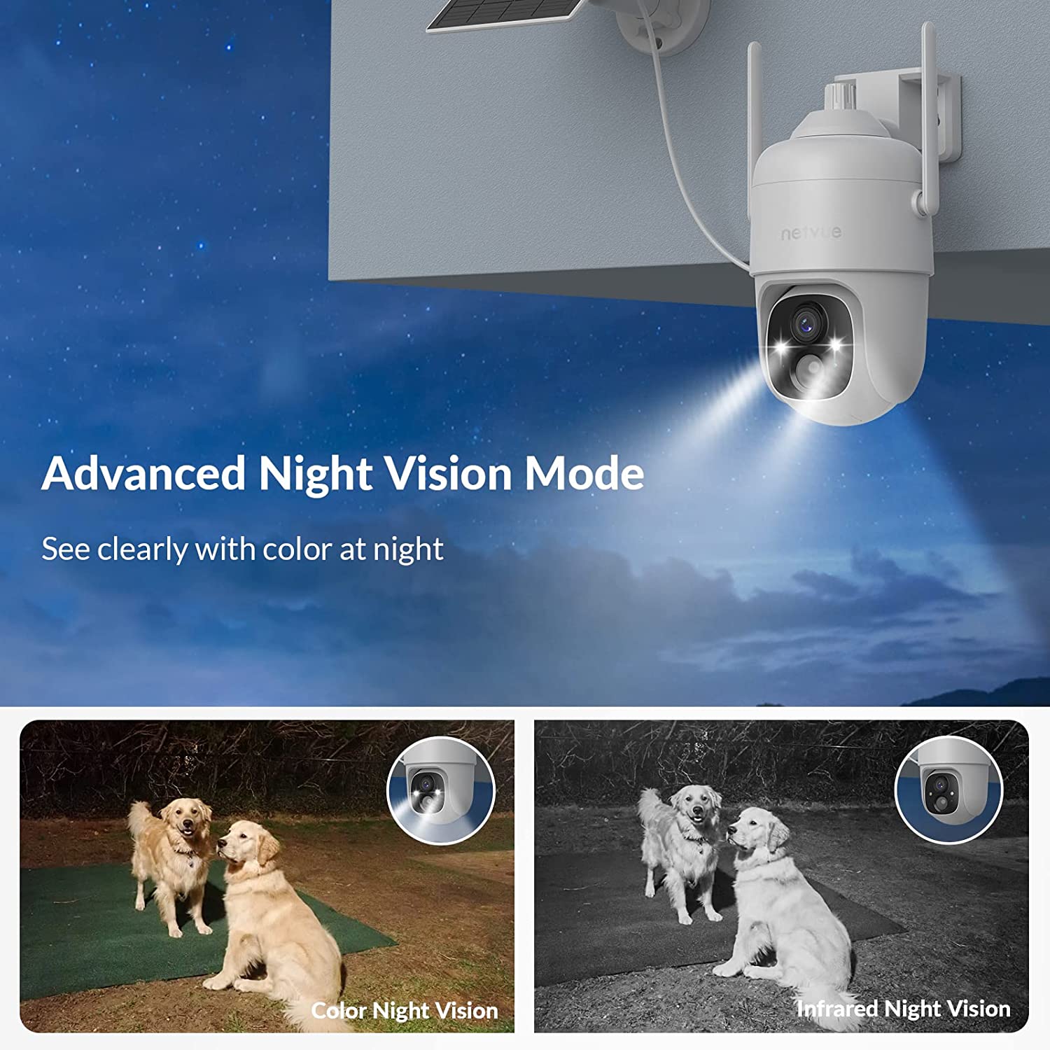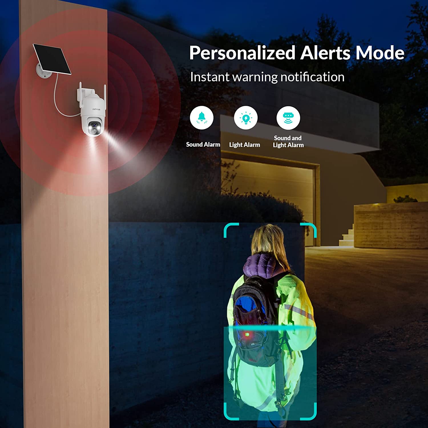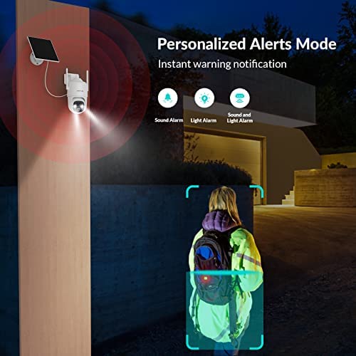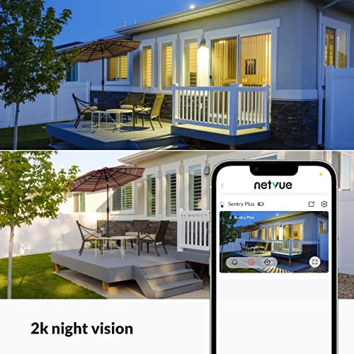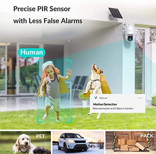 About this item 【2K 3MP & HD Color Night Vision 】3MP picture quality allows you watch and record videos with more clear details day or night. Spotlight and infrared light are optional to achieve color or infrared night vision. With the advanced CMOS sensor and spotlight, this security camera outdoor provides properly exposed video without color distortion, producing sharp, clear footage for more visual details 【Solar Powered & Wire-Free & 360°】 The solar panel will charge security camera with direct sunlight. No circuit wiring hassles, you can place it anywhere. The solar security camera is also equipped with battery inside, which provide extra 4-6 months backup battery life. 365 days Non-stop power to keep an eye on what matters. Keeping 2.4GHz WiFi on, you will never miss a thing under the 360° Field of View of the camera. 【Advanced AI Detection & 2-Way Audio】 You will know happening at the moment motion is detected by receiving instant notifications, and you can hear and talk to anyone in view of the solar wireless security camera with superior audio. No need to worry about irrelevant alerts, the advanced smart AI Skill of the Sentry plus you can choose what you care to reduce false alarms. You can also customize the sensitivity of the detection or ambient light. 【Ward off Intruders & Enhanced WiFi Antenna】 The strobe light, integrated spotlight or built-in siren will be activated once the outdoor security camera detects the intruders, even in dark areas you can see clearly. At the same time, it is equipped with a high-gain 4dbi WiFi antenna and 2.4G WiFI transmission, which can receive your data in a wider range. The network signal has good wall penetration, and strong anti-interference ability, and realizes the security protection for the whole year. 【Secure Storage & Weather-resistant】 IP66 certified to withstand rain, sun, heat and cold. Support 8-128GB micro SD card (not included) and free 7-day trial cloud storage. All the videos by NETVUE solar wireless security camera are encrypted, nobody will get it without your permission. 【Explore more advanced features】Netvue explores and develops more cloud-based and AI skill-based features to meet different users’ needs, such as cloud storage, animals/human /package/vehicle recognition…etc. You can subscribe to these services as needed. 🔔Cloud service and AI recognition services require subscription fees.