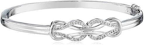 About this item Bangle bracelet featuring a figure-eight knot design with diamonds pave set in high polished sterling silver Bracelet has a 1/4 carat total diamond weight; Diamonds are I-J Color with 12-13 Clarity; All our diamond suppliers confirm that they comply with the Kimberley Process to ensure that their diamonds are conflict free Perfect jewelry gift to expand a woman’s fashion wardrobe with a classic, timeless style Secure single-latch hinged bangle closure Hand-crafted in pure .925 Sterling Silver; Rhodium plating added to enhance shine and durability Imported These silver pieces are built for longevity. This piece features a metal plating or flashing, or an electrocoating for a more lustrous appearance, but it can wear off with long-term or heavy use. To ensure the longevity of your plated items store your jewelry in a dark, cool, dry place such as a pouch or air tight box and avoid rubbing plated items together. Also try to avoid exposure to cleaning products and perfume which can both negatively affect your items. Your local jeweler can advise you where to send your jewelry if you would ever like them replated.