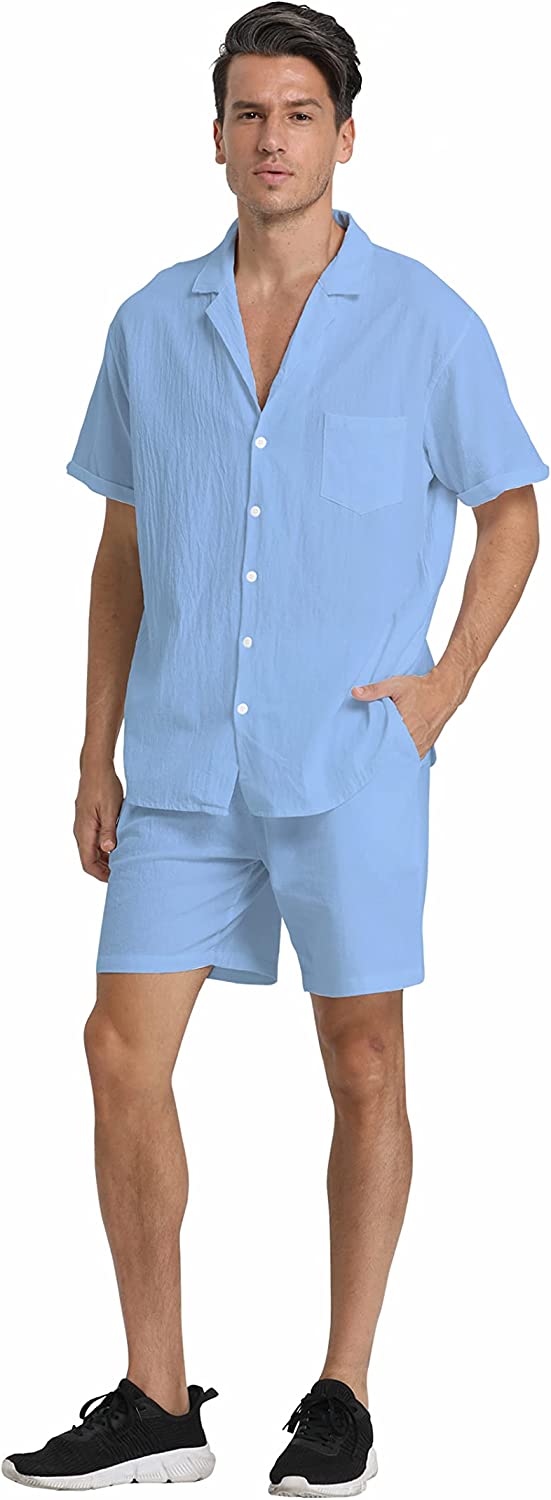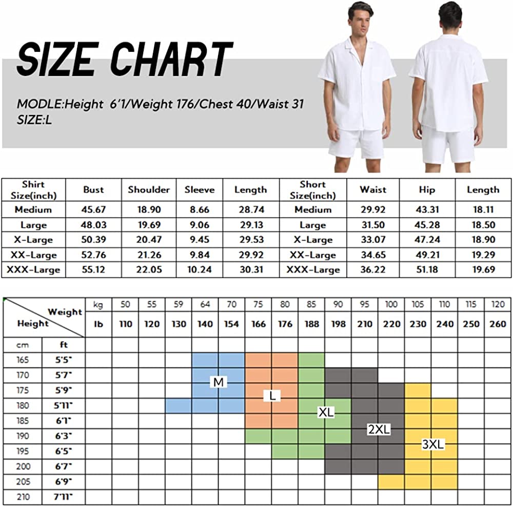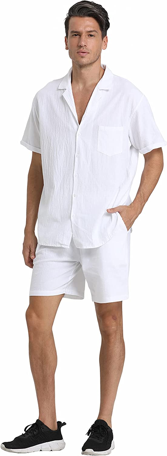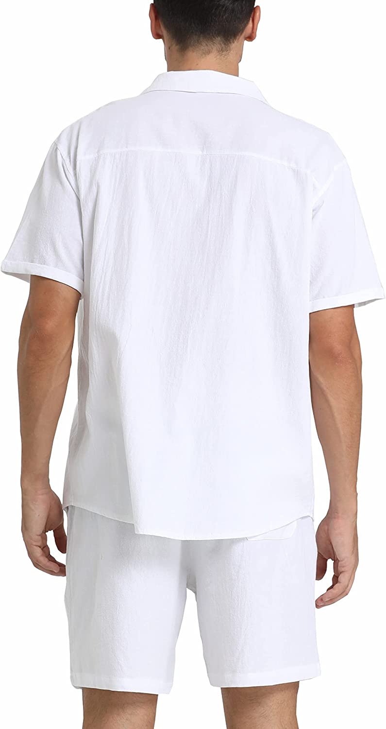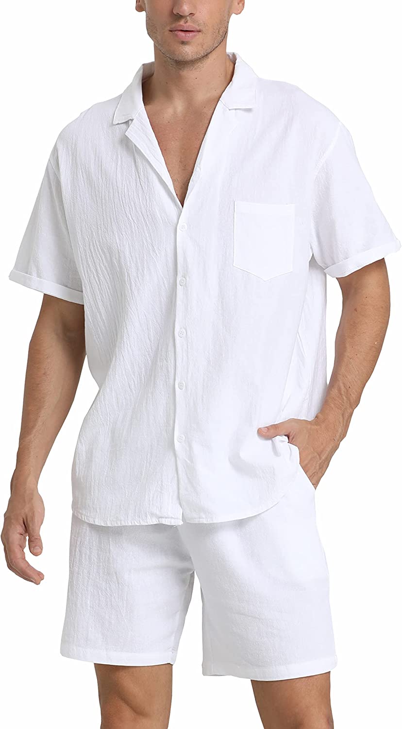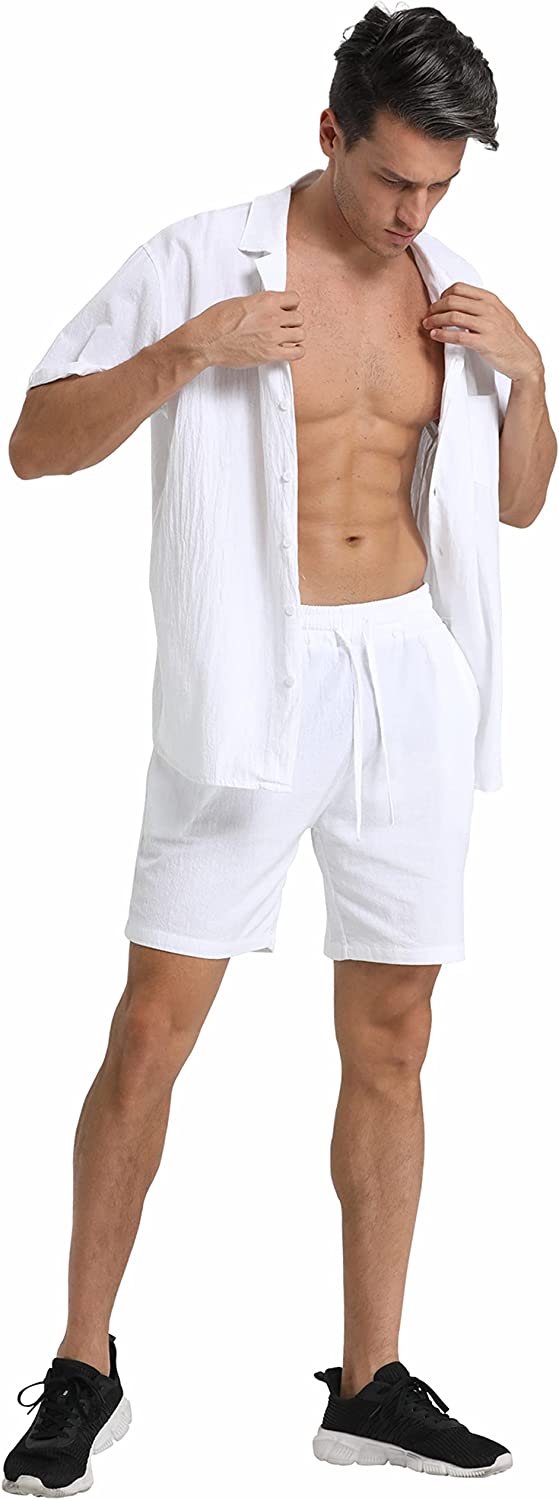 95% Cotton,5% Linen Drawstring closure Hand Wash Only Fabric&Color– 95% Cotton,5% Linen;Men’s shirt and short sets are available in White,Army Green,Black,,Grey. Style–camp-collar shirt,which can be matched with different face shapes,bow ties and ties.mens button down short sleeve shirt with a loose fit for a more casual,comfortable style.Linen pants men,Mens elastic waist pants,fastened with a drawstring;two front slip pockets and one rear slip pocket for easy storage of essentials. Occasion–Casual style,can be worn at Holiday/Travel/Party/Dating/Dinner/Birthday/Wedding/Music Festival/Camping/Fishing/Beach/Home Office. Suitable for the crowd–vacationer,students,office workers;Short sleeve button up shirts for men can be used as Valentine’s Day holiday gifts for boyfriends,husbands,fathers,etc. Season–Best for summer,spring and autumn,indoor home in winter;linen shirts for men natural texture,light and breathable,cool and comfortable to touch.
