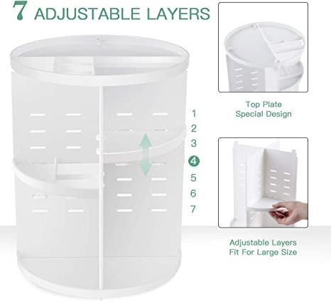 Seinlife Makeup Organizer organizer – revolving makeup organizer for your vanity, bathroom, bedroom, dressing room, easily stores any size of cosmetics and skincare products. The hollowed-out compartments on the top plate allow you to store slim and tall makeup brushes. With a 360° rotatable base and 7 layers of adjustable trays, which will greatly enhance your daily cosmetic routine. No worries about the messy cosmetics any more.