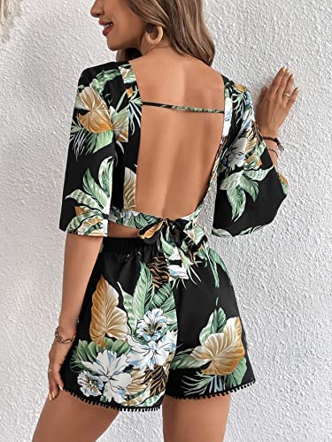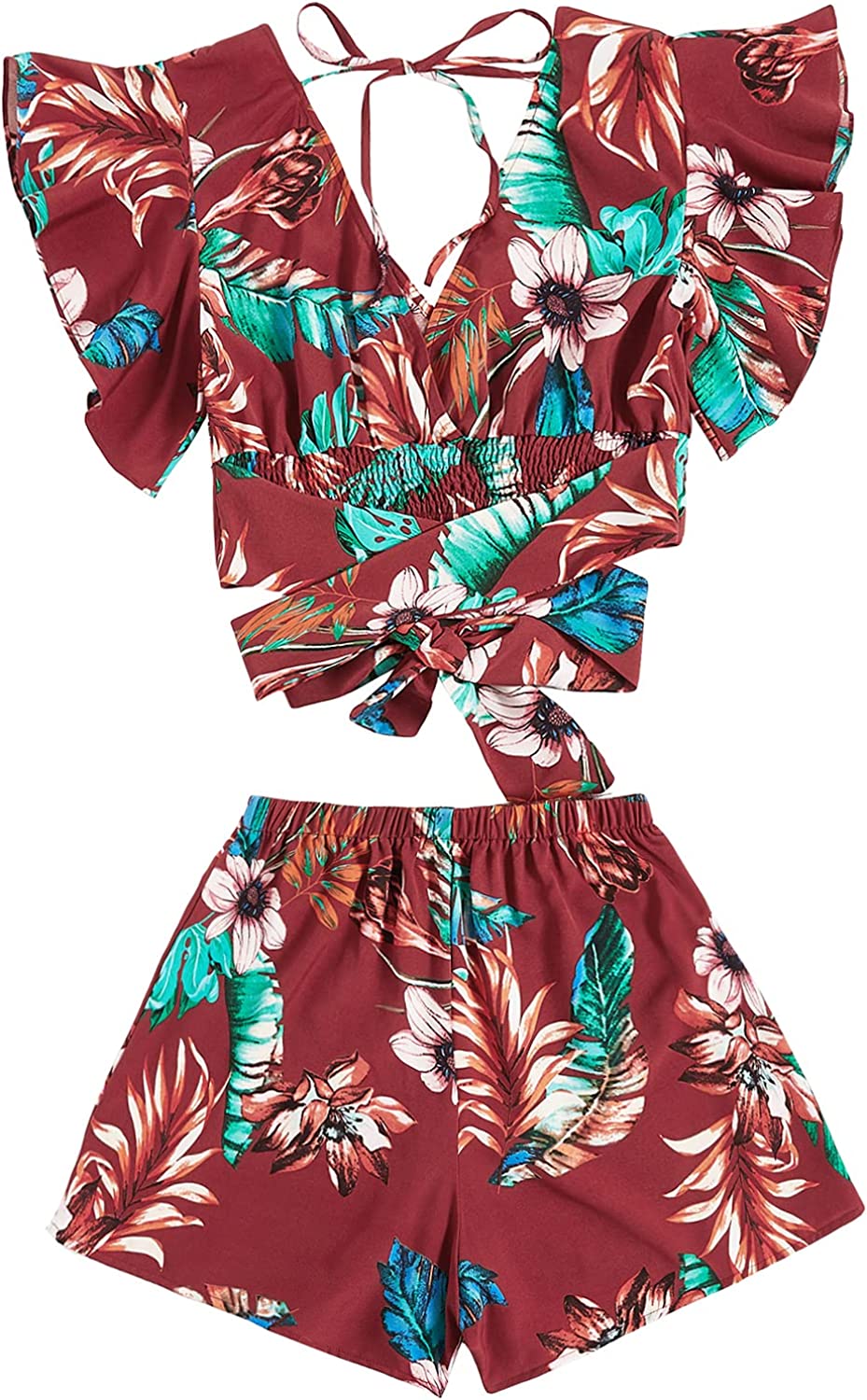 SweatyRocks Women’s 2 Piece Boho Butterfly Sleeve Knot Front Crop Top with Shorts Set Clothing, Shoes & Jewelry