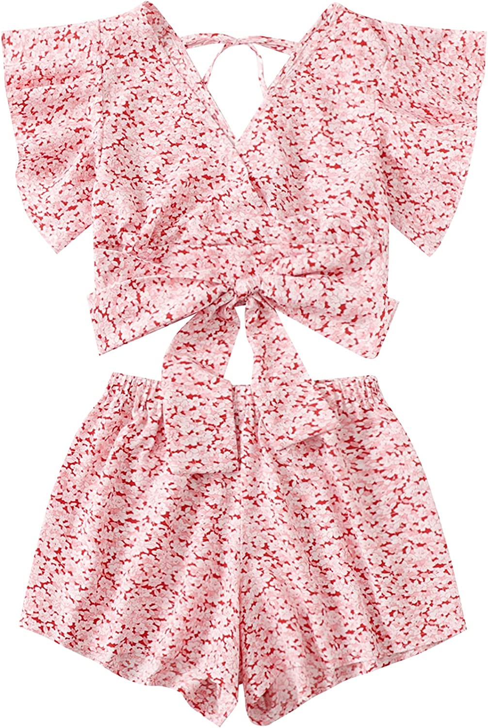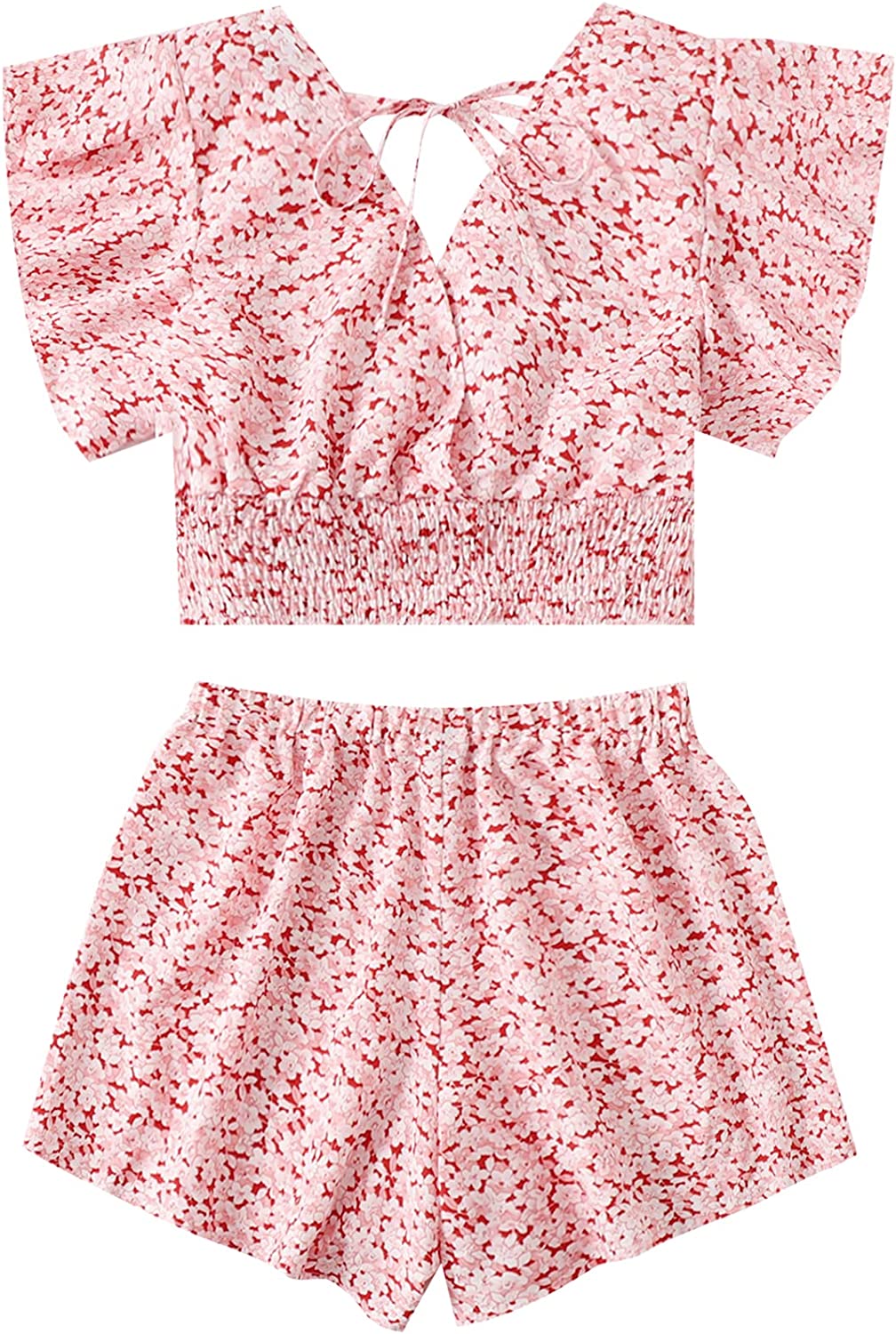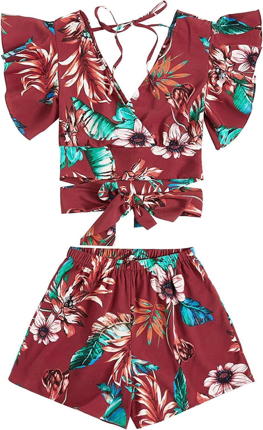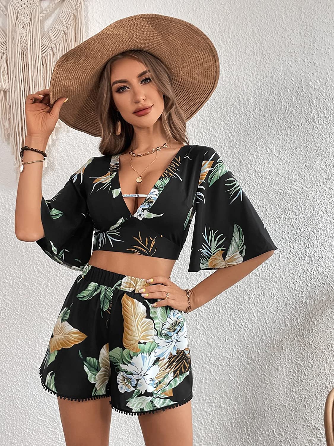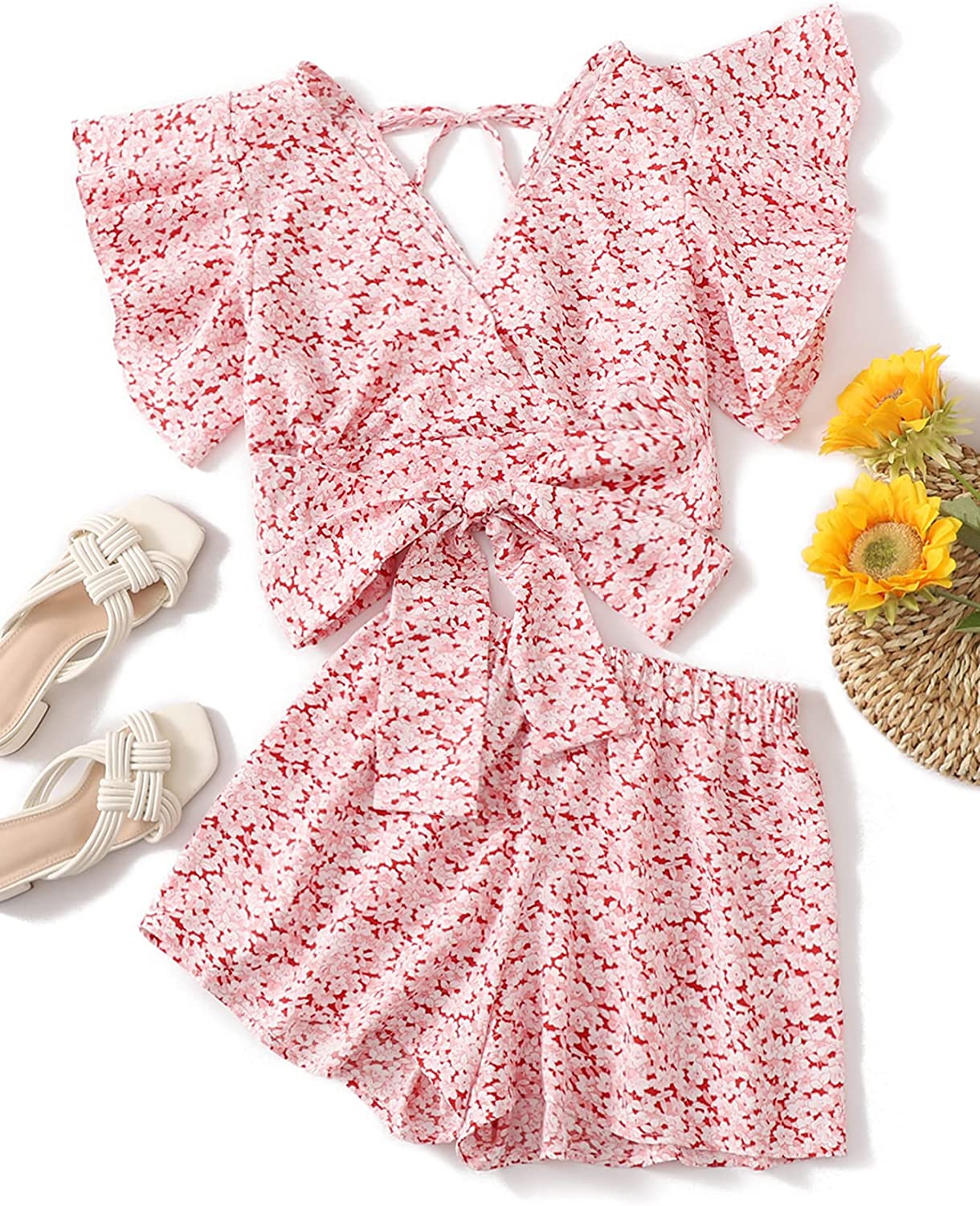 HomeWomenSummer Clothes SweatyRocks Women’s 2 Piece Boho Butterfly Sleeve Knot Front Crop Top with Shorts Set Clothing, Shoes & Jewelry