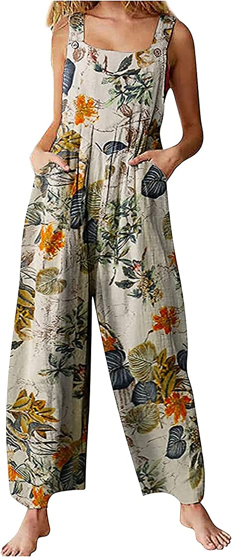HomeWomenSummer Clothes Women’s Casual Sleeveless Wide Leg Overalls Jumpsuit Wide Leg with Pockets Casual Loose Flowers Print Pants Overalls