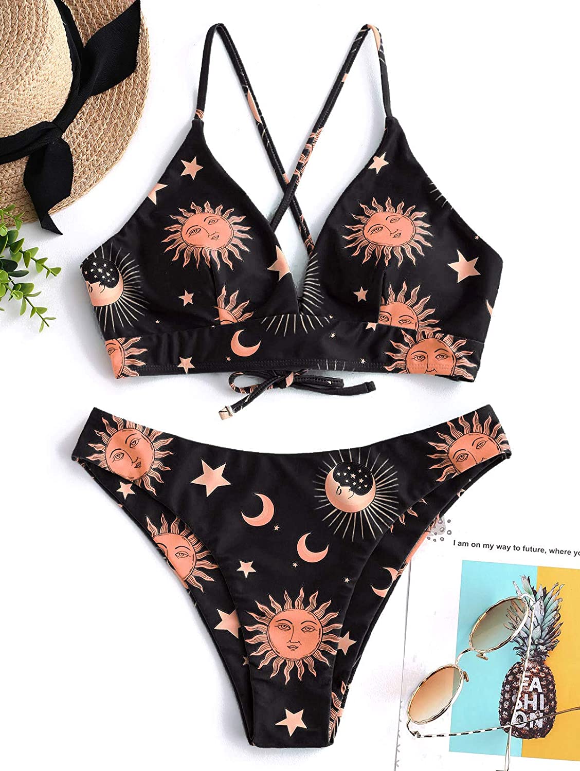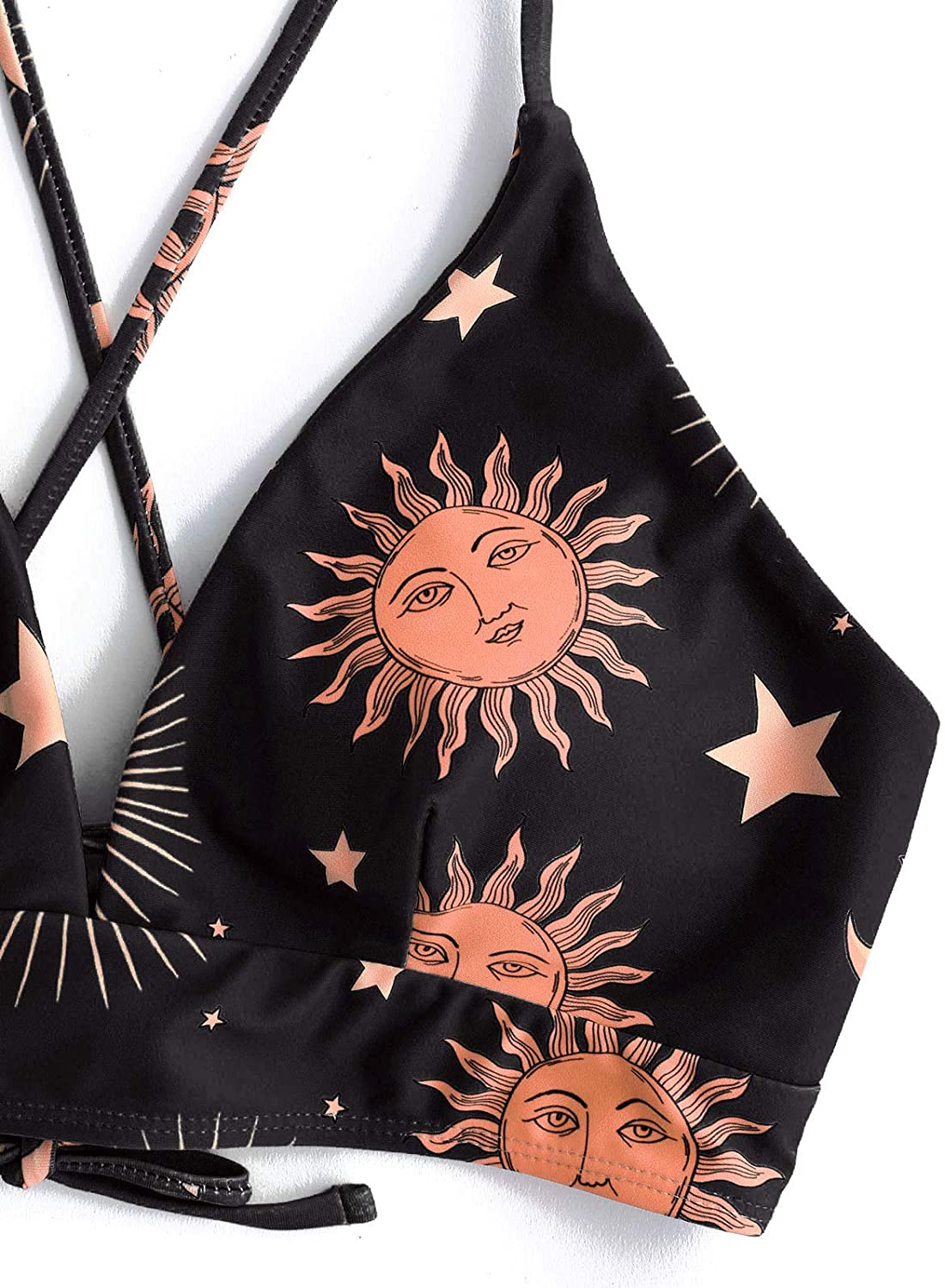 ZAFUL Star Sun Moon Print Bathing Suits for Women Back Criss Cross Lace-up Triangle Bikini